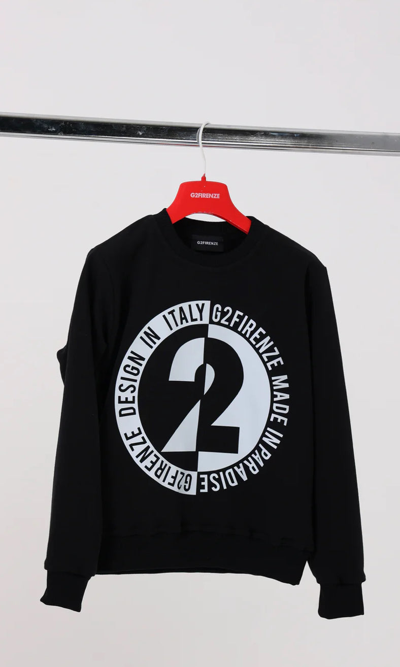 La felpa "BLACK AND WHITE" è un capo dallo stile audace e contemporaneo. Realizzata in tessuto morbido e confortevole, presenta un design a contrasto con un maxi logo centrale diviso in bianco e nero, circondato dalla scritta "G2 FIRENZE - MADE IN PARADISE". Il classico taglio con polsini e orlo elasticizzati assicura una vestibilità perfetta, ideale per outfit casual e streetwear di tendenza.